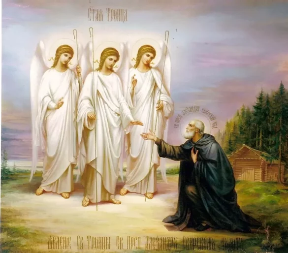 Ani multi au trecut de cand sfantul s-a stabilit in aceasta pustie, pana sa afle voia lui Dumnezeu. Astfel, trecand mai bine de 23 de ani, Domnul a binevoit a I se arata, in chipul a Trei Ingeri, precum si odinioara, lui Avraam, la Stejarul lui Mamvri. Fiecare inger era lumina adanca si purta in mana un sceptru.