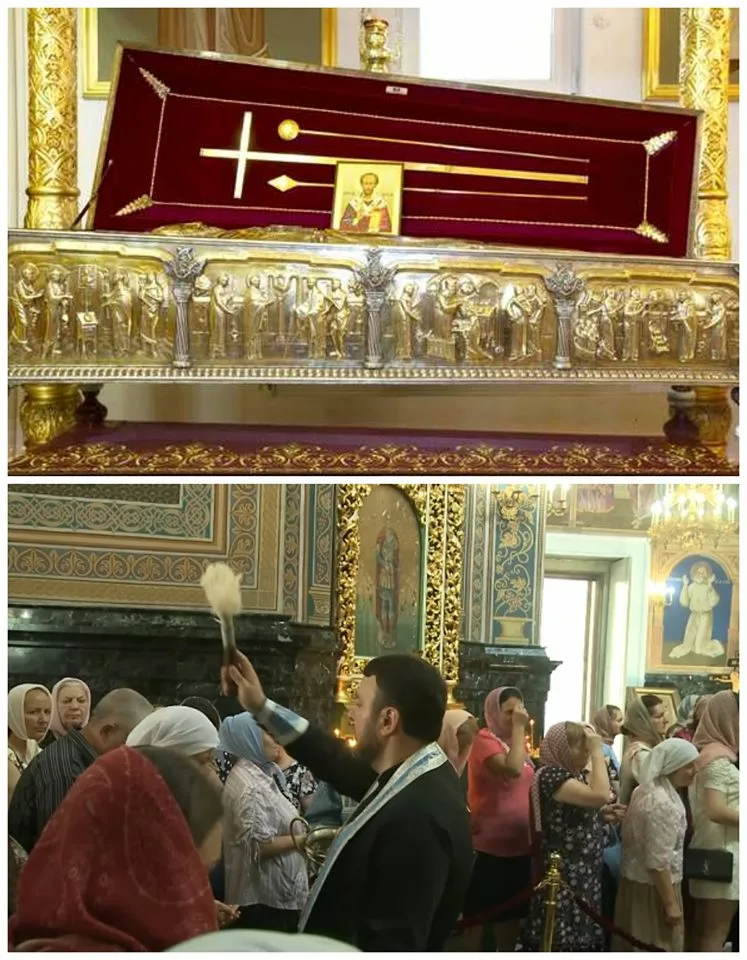 Racla care continea Sfintele moaste a fost ingropata in Sfantul Altar, alaturi de Moastele Sfantului Grigorie Teologul.