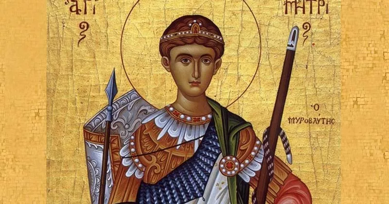 Învățătorului dreptslăvitoarei credințe celei întru Hristos, surpătorului și rușinătorului păgânătății, Izvorâtorului de mir, Marelui Mucenic Dimitrie, ostașul cel adevărat al lui Hristos, care s-a arătat Bisericii ca un soare și mare apărător credincioșilor, toți acum cântări de mulțumire și laude din suflet cu dorire aducându-i să-i cântăm: Bucură-te, Izvorâtorule de mir, Mare Mucenice Dimitrie!