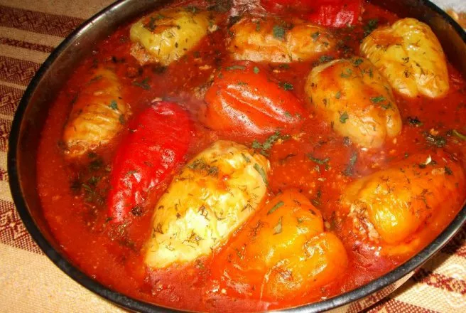La final, adăugăm sare, piper după gust. Se umplu ardeii şi îi aşezăm într-o cratiţă mai înaltă. Se adaugă apă caldă şi câteva rondele de roşii. Se adaugă după gust o linguriţă de vegeta şi se lasă ardeii la fiert la foc mic. Spre final dizolvăm o lingură de făină în apă şi adăugăm în sos. Sunt gata când zeamă a scăzut şi ardeii au fiert. Se adaugă verdeaţă tocată mărunt. Se servesc calzi împreună cu sos. Poftă bună!