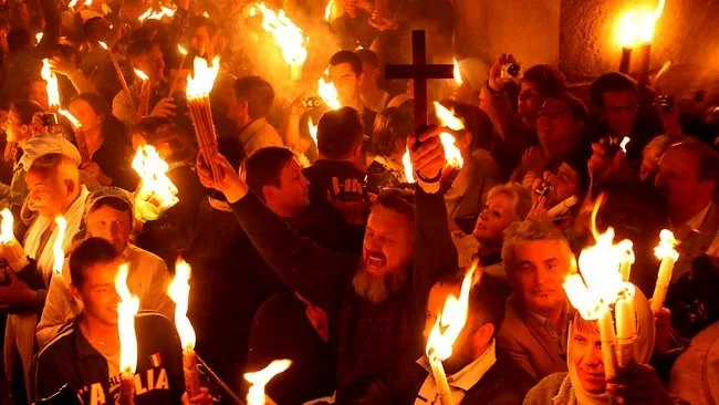 „Atunci am desluşit chipul patriarhului, care s-a plecat să intre în Mormântul dătător de viaţă. Exact în acea clipă, când agonia mea ajunsese la o înfricoşătoare încordare nervoasă în mijlocul tăcerii mormântale, în care îmi auzeam şi răsuflarea, am auzit deodată un şuierat uşor. Semăna cu suflare uşoară de vânt. Şi îndată am văzut o privelişte de neuitat: o Lumină albăstruie a umplut tot sfinţitul loc al dătătorului de viaţă Mormânt…Câtă frică şi cutremur nu mi-a pricinuit acea Lumină albăstruie, în care Îl vedeam clar pe patriarh, de pe faţa căruia curgea transpiraţia… Şi, ca şi cum ar fi fost luminat de acea Lumină, a început să citească rugăciunile… Şi îndată Lumina albăstruie a început să se preschimbe într-o Lumină albă, ca aceea a Schimbării la Faţă a lui Hristos.