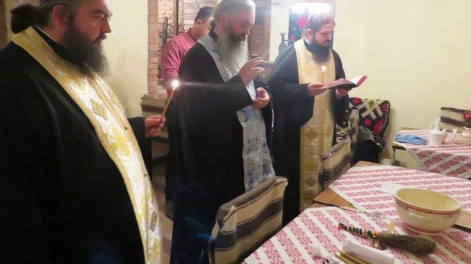 Preotul va sta în faţa măsuţei, iar credincioşii vor sta în spatele preotului, aşa cum stăm şi la biserică, toţi cu faţa la răsărit. Toate uşile camerelor vor fi larg deschise.